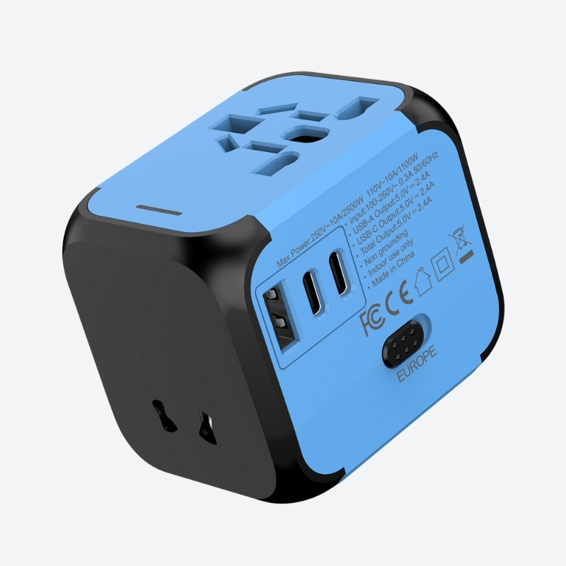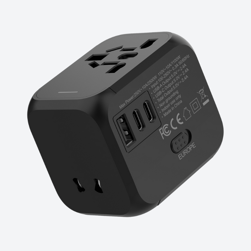 Adaptador Universal de Viaje 3 en 1 con Puertos USB y Tipo-C – Enchufe Internacional Multifuncional