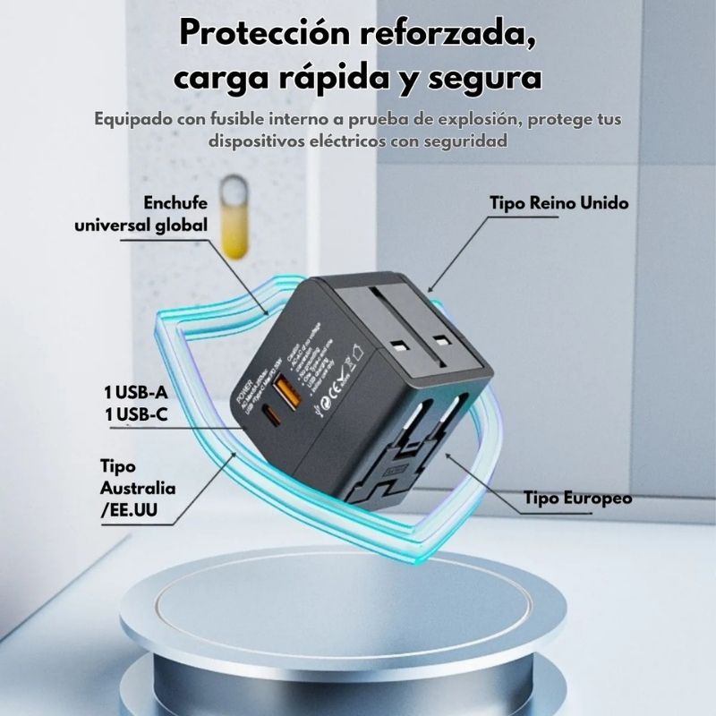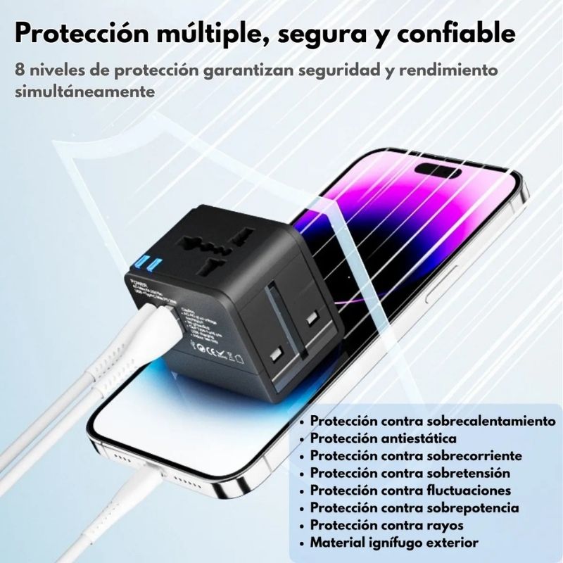 Cuenta con fusible de seguridad de 8A, protección contra sobrecarga, cortocircuito y sobrecalentamiento, asegurando un uso confiable en cualquier lugar del mundo.