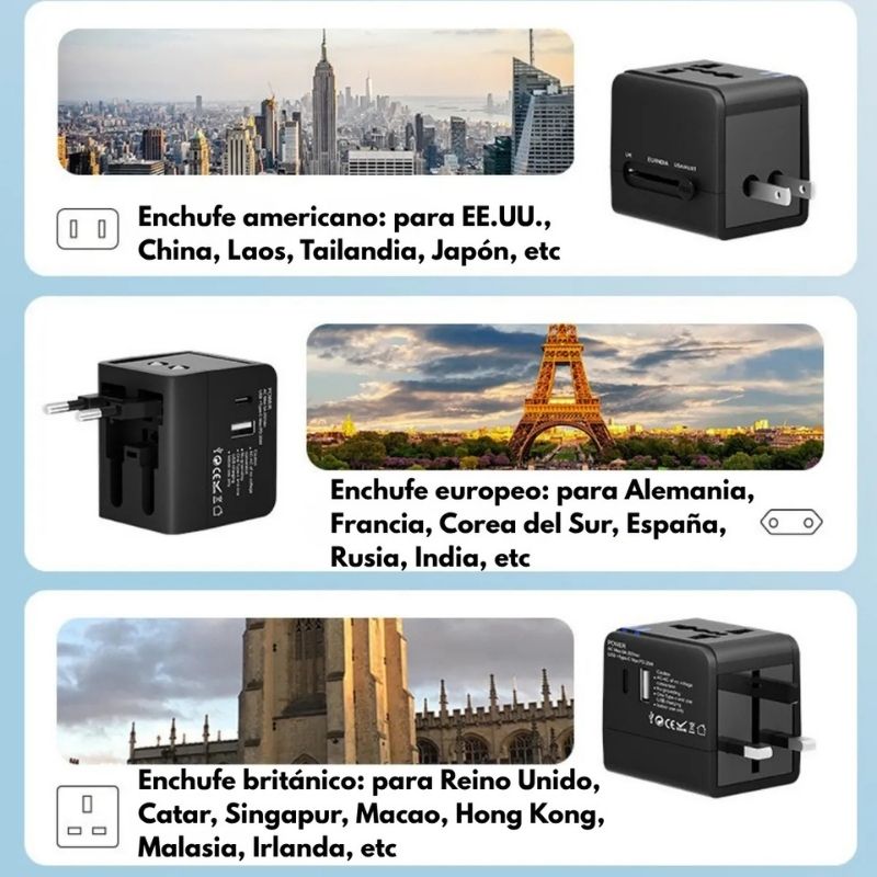 Adaptador universal con 6 tipos de enchufe retráctil (EU / UK / US / AU / Asia / Universal). Perfecto para viajeros que visitan distintos países y buscan un solo dispositivo para todo.