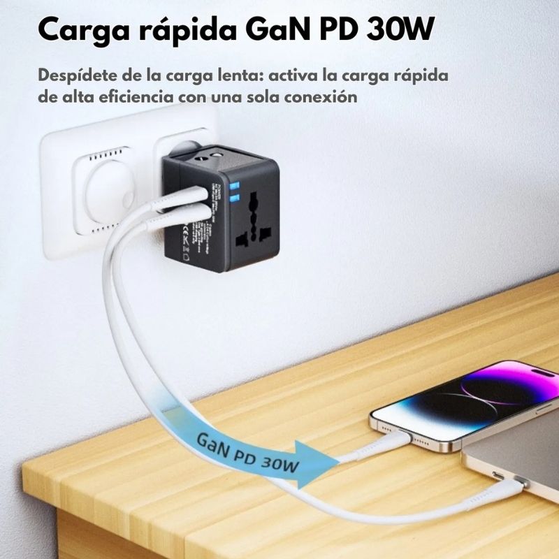 Ofrece una potencia total de 30W con 1 puerto USB-A QC y 1 puerto Type-C PD, permitiendo cargar smartphones, tablets, cámaras y notebooks ligeras con eficiencia y velocidad.