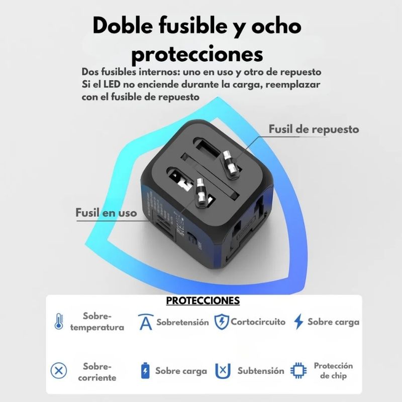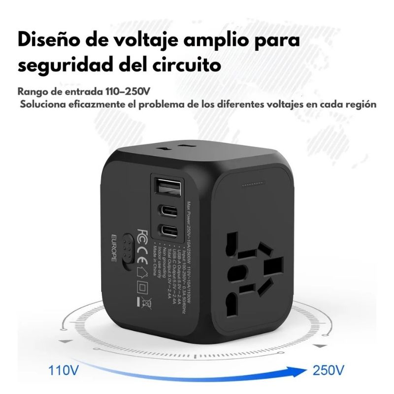 Viajá sin límites con este adaptador universal 3 en 1, compatible con más de 150 países. Con puertos USB y Tipo-C de carga rápida, diseño compacto y protección total, es el compañero perfecto para tus aventuras alrededor del mundo.