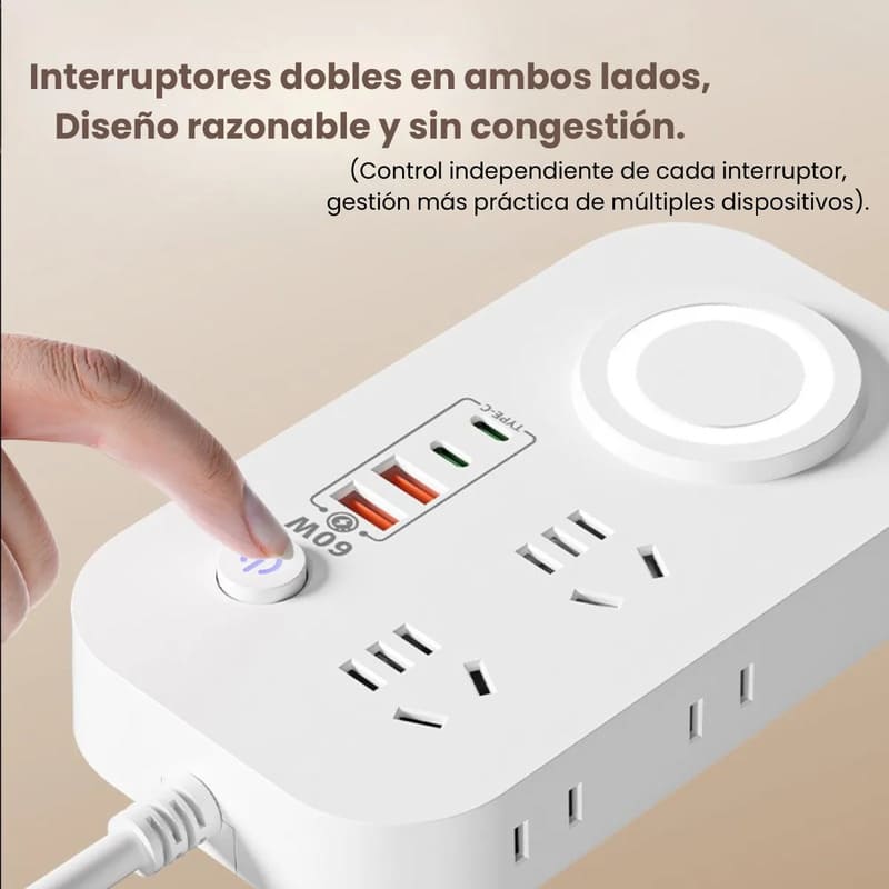 Equipada con puertos USB de 60W y carga inalámbrica Qi de 10W, permite alimentar notebooks, tablets y smartphones modernos de forma rápida, estable y segura. Apoyá tu celular y seguí con tu día.