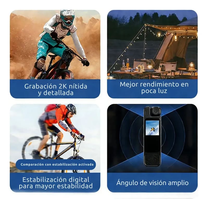 Ofrece calidad 2K nativa verificada, logrando una nitidez superior frente a modelos convencionales. Permite capturar texturas, rostros y paisajes con mayor detalle, ideal para documentar viajes, recorridos en moto o actividades al aire libre.