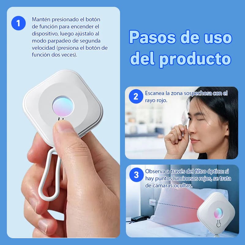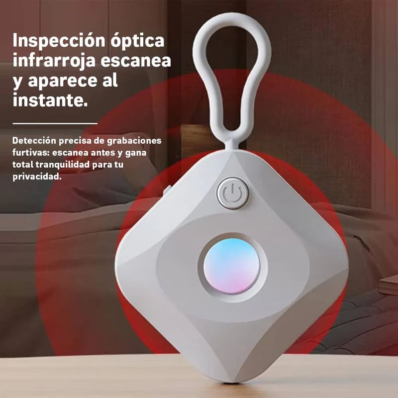 Sensor óptico infrarrojo de alta potencia que detecta lentes reflectantes mediante luz roja. Expone cámaras ocultas y dispositivos de espionaje, incluso los más discretos.